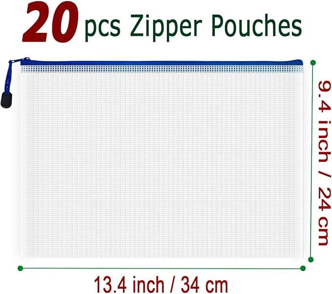 • 20 Pcs zipper pouches A4 Size 13.4 x 9.4 inch. Widely used in office supplies, school classroom, home daily life, hospital and travel. These storage bags for organizing could meet your needs in all ways to save space