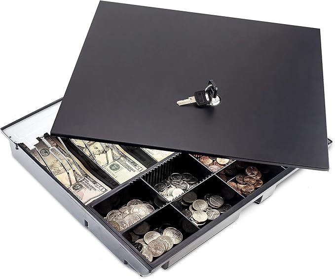 • ORGANIZE AND SECURE CASH: This 16 inches cash drawer with locking cover is a great separator and divider for your bills and cash. With 5-bill and 8-coin compartments and lid, this money storage box with lock lets you organize and secure your cash. It’s perfect for Volcora 16” fully-removable cash registers.