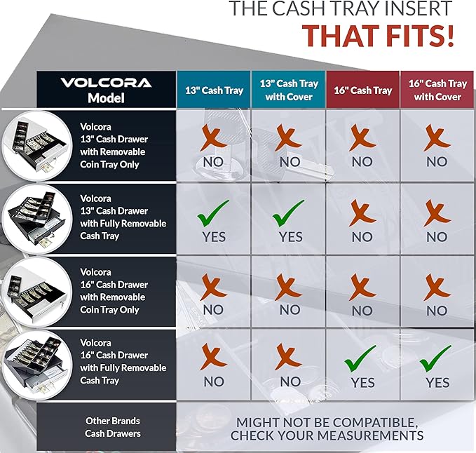• ORGANIZE AND SECURE CASH: Volcora's 13 inches mini cash drawer with locking cover is a great separator and divider for your bills and cash. With 4-bill and 5-coin compartments and lid, this money storage box with lock lets you organize and secure your cash. It’s perfect for Volcora 13” cash registers with fully removable cash tray.
