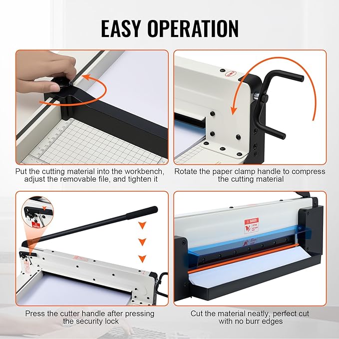 • Effortless Operation: The lengthened handle makes paper cutting much easier. Besides, adjust the paper pressing device through the rotating handle on the right side of the paper cutter to fix the paper position. It's quite labor-saving. Non-skid rubber feet for table use can prevent the machine from moving during the paper cutting operation.