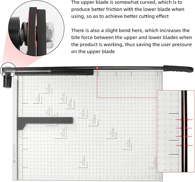• 【About the blade】--This paper cutter contains two steel bars, the upper and lower, and the upper bar is somewhat curved to create better friction with the lower bar when in use, resulting in better cutting results