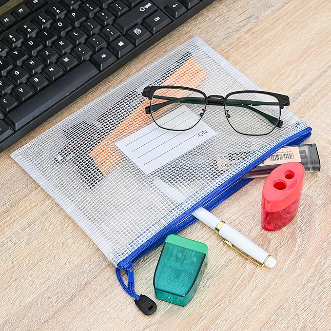 • 12Pcs Mesh zipper bags with label pocket, A5 size 9.2x6.7 inch. Widely used in Office Home Hospital and Travel. Great zipper file bags, board game storage bags, pencils pouches, puzzles bags, cross stitch projects bags or keeping various craft projects organized. These mesh bags could meet your needs in all ways
