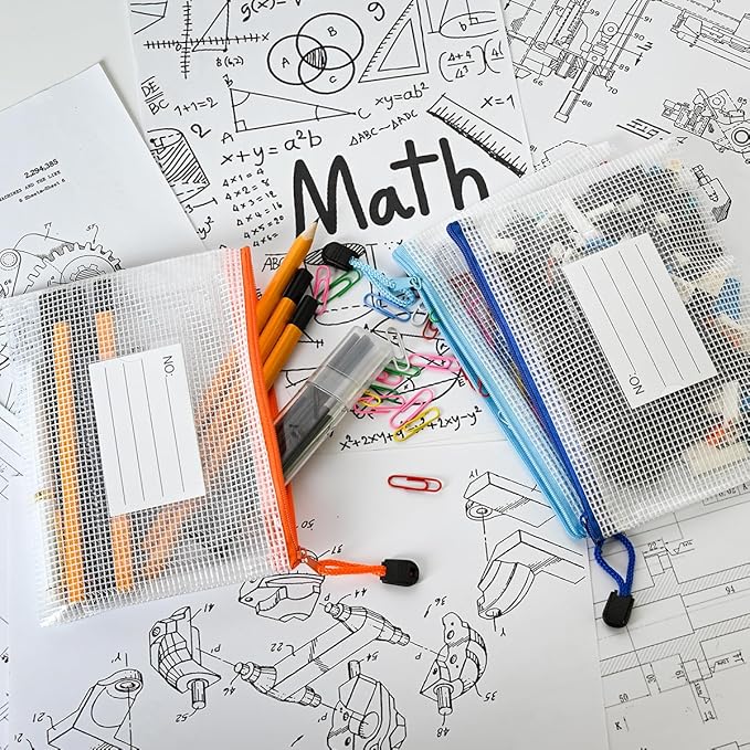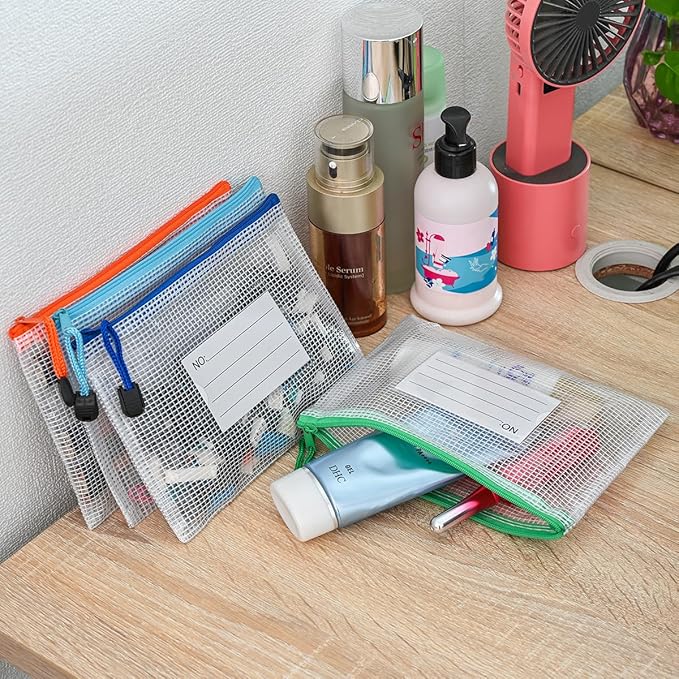 • 12Pcs Mesh zipper bags with label pocket, B6 size 7.6x5.3 inch. Widely used in Office Home Hospital and Travel. Great zipper file bags, board game storage bags, pencils pouches, puzzles bags, cross stitch projects bags or keeping various craft projects organized. These mesh bags could meet your needs in all ways