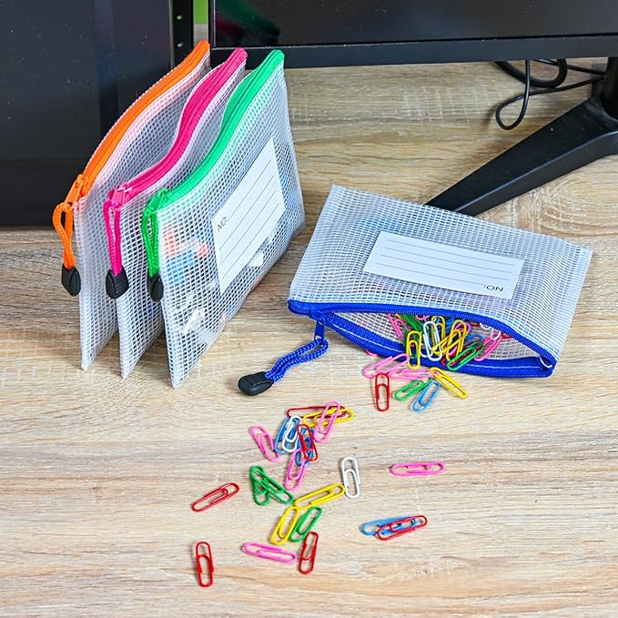 • 12Pcs Mesh zipper bags with label pocket, A6 size 6.3x4.7 inch. Widely used in Office Home Hospital and Travel. Great zipper file bags, board game storage bags, pencils pouches, puzzles bags, cross stitch projects bags or keeping various craft projects organized. These mesh bags could meet your needs in all ways