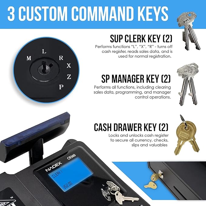 • šŸ’µ 3 Custom Command Keys: SUP Clerk Key is used to turn off the cash register and preform normal register use. SP MANAGER key perfroms all functions, including clearing sales data, programming, and manager control operations. Cash DRAWER key locks and unlocks the cash register drawer.