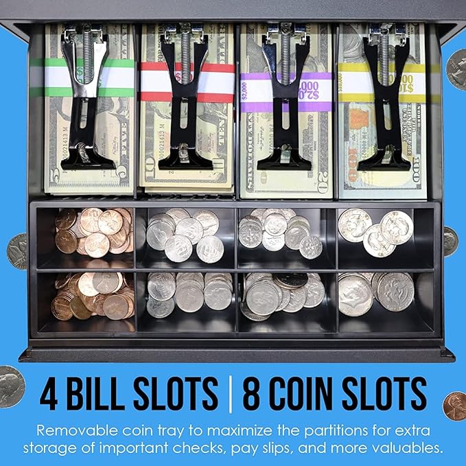 • šŸ’µ 4 Bill Slots, 8 Coin Slots: stores multiple denominations of currency, with a removable coin tray to store important valuables underneath, like checks, pay slips, and more.