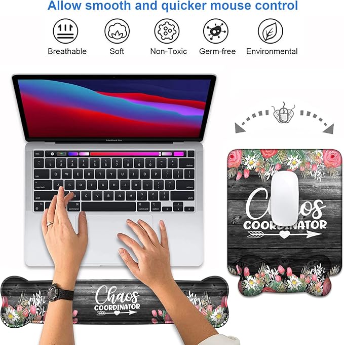 Keyboard Wrist Rest & Mouse Pad Wrist Support Set, Chaos Coordinator Quotes Colored Floral Wreath Print Design Non-Slip Rubber PU Base for Home Office Working Studying Easy Typing & Pain Relief