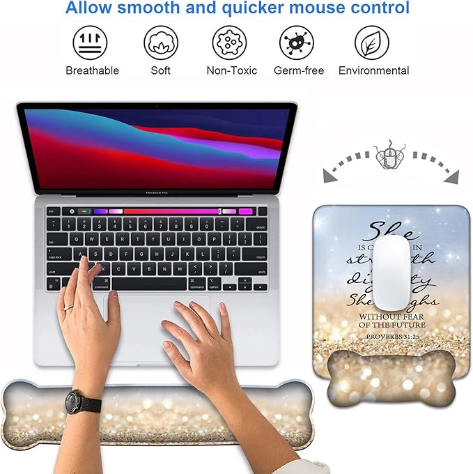 Wrist Rest Support Ergonomic Gel Mouse Pad & Memory Foam Keyboard Set, Non-Slip Rubber PU Base for Home Office Working Studying Easy Typing & Pain Relief - Bible Verses Proverbs 31:25