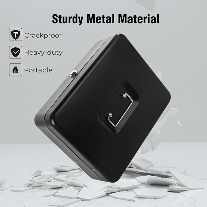 • HEAVY DUTY MATERIAL: The cash box with lock is made of heavy-duty metal. The money lock box weighs 1.8kg, being strong and durable to prevent it from drops and impacts. Both the money box and the key lock are of durable material quality and can be used for a long time.