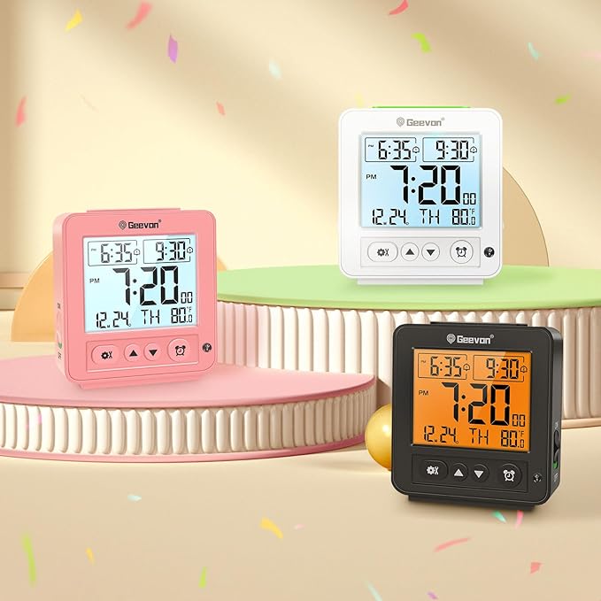 • 【Multifunctional Table/Desk alarm clock】The Geevon smart night light digital alarm clock measures 3.5 (L) * 1.4 (W) * 3.8 (H) inches, small and light. It is an easy cordless battery alarm clock, powered by 2 AA batteries (not provided), features clear LCD display, alarm clock, calendar, smart night light, 8s backlight, 12 / 24-hour, indoor temperature.Basic bedside table alarm clock easy for kids, teens, adults to use