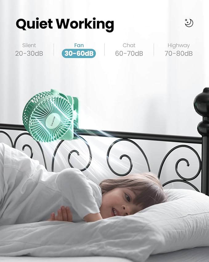 • Also Safe for Baby: The mini clip fan only has 5.5mm gaps, so it will protect the infant's little fingers from entering; While keeping toddlers safe, still works quietly and provides powerful wind