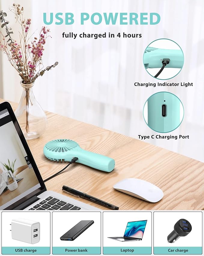 • Comfortable Design: Designed with the anti-slip handle that conform to ergonomic principle, this electric fan is very easy to hold even by small hands, and our sleek curve handle makes it more cosy than others’ straight handle when you use. The lollipop shape is unique and cute that would be an ideal gift for stylish girls, boys, men, women and kids