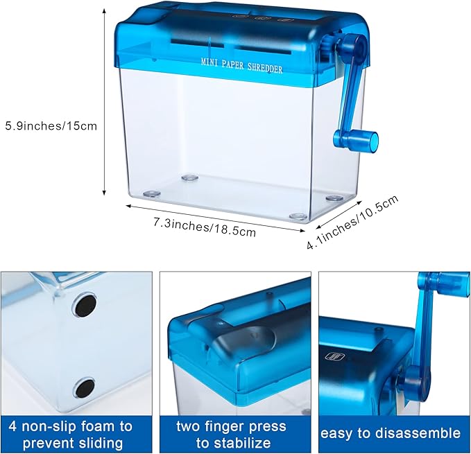 • Long Time Usage: our manual paper shredder is made of quality plastic material, strong and sturdy enough, not easy to break or deform, with 4 nonslip foams at the bottom avoiding sliding, serving you for a long time