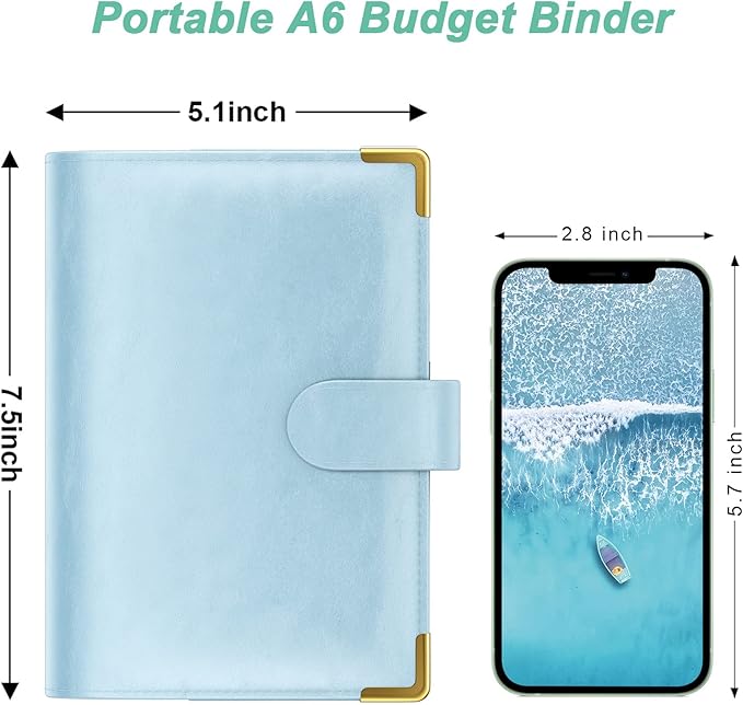 • Practical A6 Money Binder: Cash envelopes binder measures about 7.5 x 5.1 inches. Made from water-resistant PU leather, designed with attractive illustration and gold metal trim that protect corners from wear, balance between aesthetics and utility