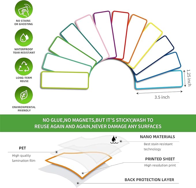 • 💖Reusable Dry Erase Labels: dry erase sticky labels are made of Freon-free Nano Material and dry erase film, smooth writing and wipe off easily, no wear in use and easy to clean, no glue, no magnetic but can stick well, heat resistant, microwave safe, just WASH to Renew if get dirt or stickless, really reuse again and again