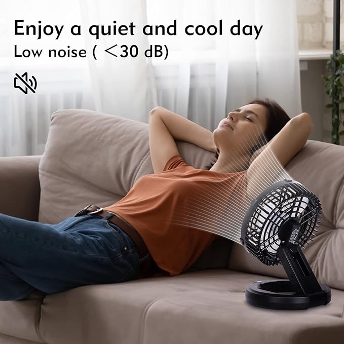• 🍃【4-in-1 Update Design】 Camping fan with Foldable & Night Light & Hook & Battery Powered; The foldable base design makes the desk fan easy to carry and versatile.The portable fan very suitable for indoor and outdoor use. Combined with camping lantern and hanging hook, the design of ultra long power supply is more suitable for camping, fishing, and picnics, travel, home bedroom. Camping fans bring you cool, quiet, but strong wind