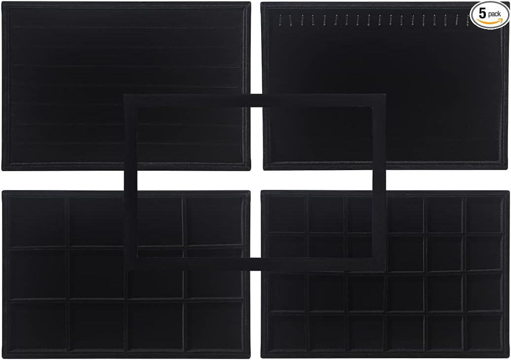Coward Set of 5 Stackable Jewelry Organizer Tray Necklace Earring Box Storage Ring Bracelet Display Holder (Black(ring+necklace+earring+12grid))