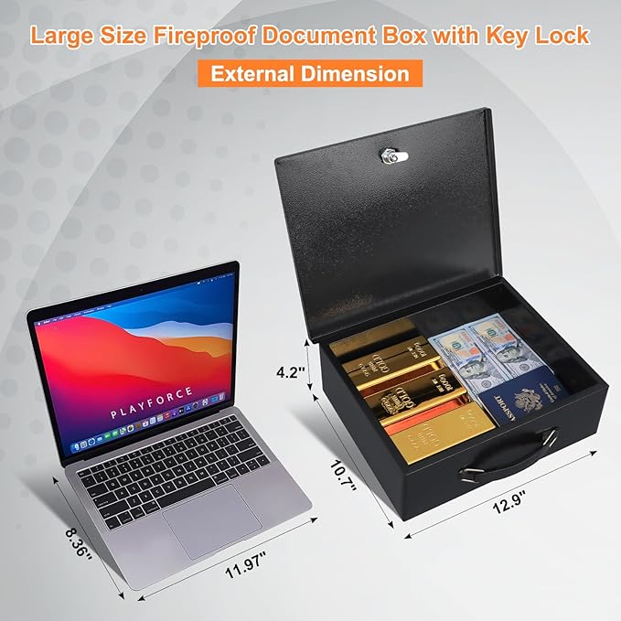 • LARGE CAPACITY: KYODOLED Fireproof Document Box size is 12.9'' x 10.7'' x 4.2'', Fire Resistance Security Chest can protect your most valuable items including passports, licenses, certificates, cash, precious photos, jewelry and so on.