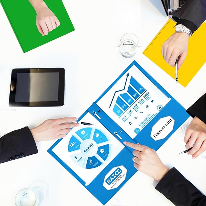 • TWO POCKET FOLDER SET: RAZCC paper file folders with 2 inner pocket, 3 prongs and 2 business card slots. 100 Pack in off - green, cyan, orange, yellow and magenta, color-code your notes or documents in these specific colors to keep them organized by subject or project