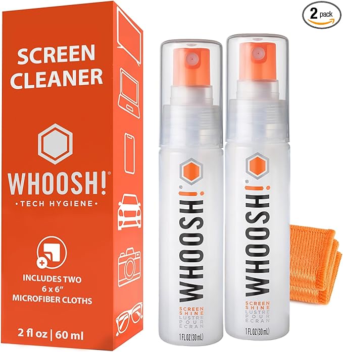 WHOOSH! Screen Shine Go 2-Pack – Two 1 fl oz Refillable Touchscreen Cleaners with Microfiber Cloths for Car, iPad, Laptop and Eyeglasses – Powerful Streak-Free Cleaning – Pocket-Sized, TSA-Approved