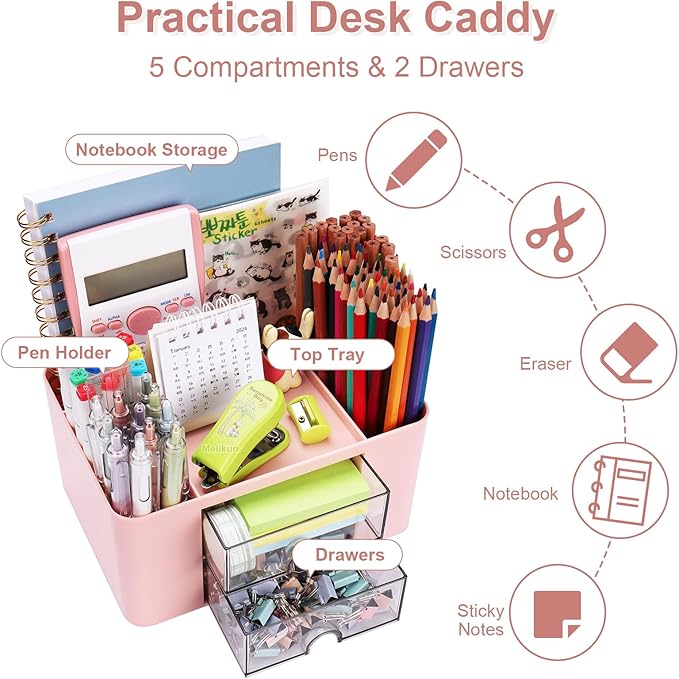 Plastic Pen Organizer, Multifunctional Desk Organizer with 2 Drawers, 4 Compartments & a Top Tray, Pencil Holder Desktop Organizers and Accessories for Office, 7.7" x 5.5" x 3.9" (Pink)