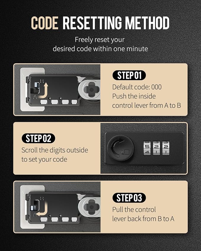 • Resettable Code: Initial code: “000”. Push the control lever inside the cabinet from A to B, set your desired code and then pull the lever back from B to A to complete code resetting.