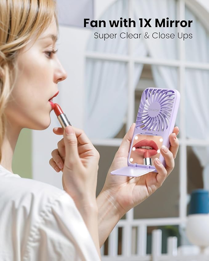 Gaiatop Portable Handheld Fan, 3 Speed LED Makeup Mirror with Light, Folding Stand for Desktop, Rechargeable Mini Personal Fans Small Travel Essentials Gifts for Women Girls