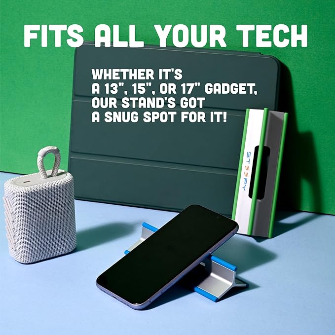 • SETUP'S A BREEZE - Just unfold and go—no screws, no hassle. Instant use, instant time saver! Steepy desk laptop stand is a travel laptop stand made out of strong and durable recycled plastic, with rubber edges to provide the sturdy and stable support your device needs and prevent it from sliding or skidding.