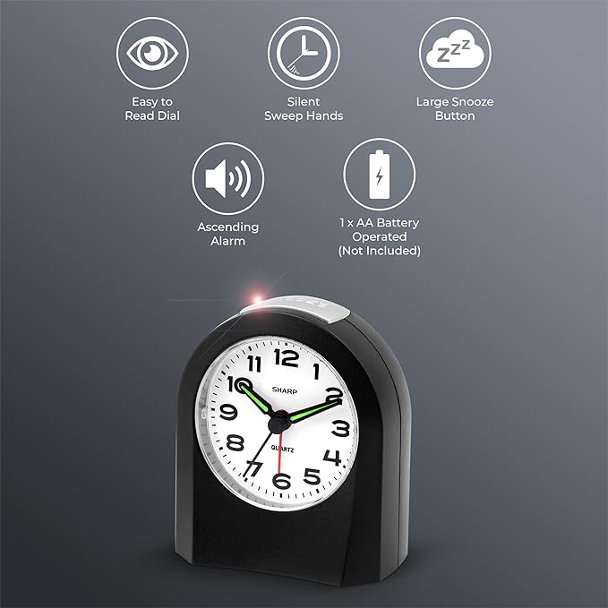 Sharp Small Battery Operated Analog Alarm Clock Silent No Ticking, Lighted on Demand and Snooze, Beep Sounds, Gentle Wake, Ascending Alarm