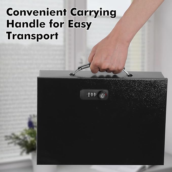 KYODOLED Fireproof Lock Box for Documents, Dual Combination and Key Lock Security with Carrying Handle, Metal Strong Safe Box to Keep Personal Items, Documents, Exterior 13.2''x 11''x4.13'', Black