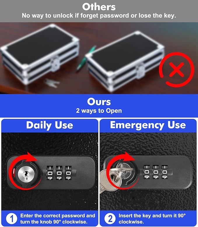 • DUAL LOCK SYSTEM:KYODOLED metal lock box equipped with dual combination lock and key lock,giving you the option of locking it by key or combination.The combination lock is defaulted to 000 and can be set to the three digits of your choice. 𝐍𝐨𝐭𝐞:𝐏𝐥𝐞𝐚𝐬𝐞 𝐥𝐞𝐚𝐯𝐞 𝐭𝐡𝐞 𝐤𝐞𝐲 𝐨𝐮𝐭𝐬𝐢𝐝𝐞 𝐭𝐡𝐞 𝐛𝐨𝐱 𝐭𝐨 𝐚𝐯𝐨𝐢𝐝 𝐟𝐨𝐫𝐠𝐞𝐭𝐭𝐢𝐧𝐠 𝐭𝐡𝐞 𝐜𝐨𝐝𝐞.