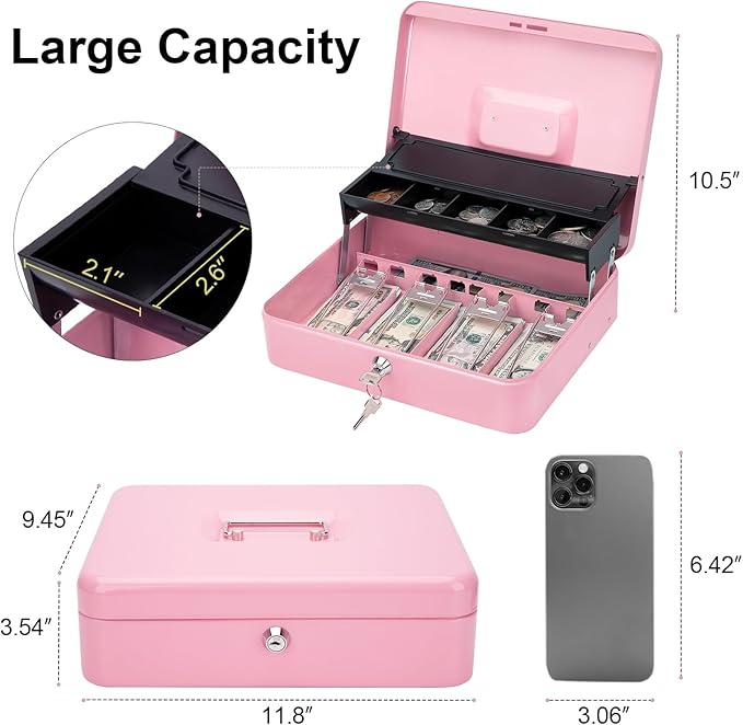 Jssmst Locking Cash Box with Money Tray and Lock, Metal Money Box with Change Lid, 11.8L x 9.5W x 3.5H Inches, Safe Box for Money with Key Lock Pink, SM-CB0515P
