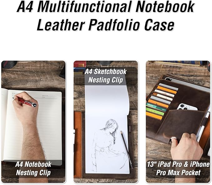• 💻【Sleek Vintage Design】➯ Handcrafted with a minimalist vintage aesthetic, this product offers a pleasing tactile experience. Measuring 12.2" x 10.24" x 0.59", it's the perfect slim fit for 11"/12.9"/13" iPad Pro and Cards/ID/Phone/A4 Size Notebook/Sketchbook/Pen. Combining protection with sleek portability.