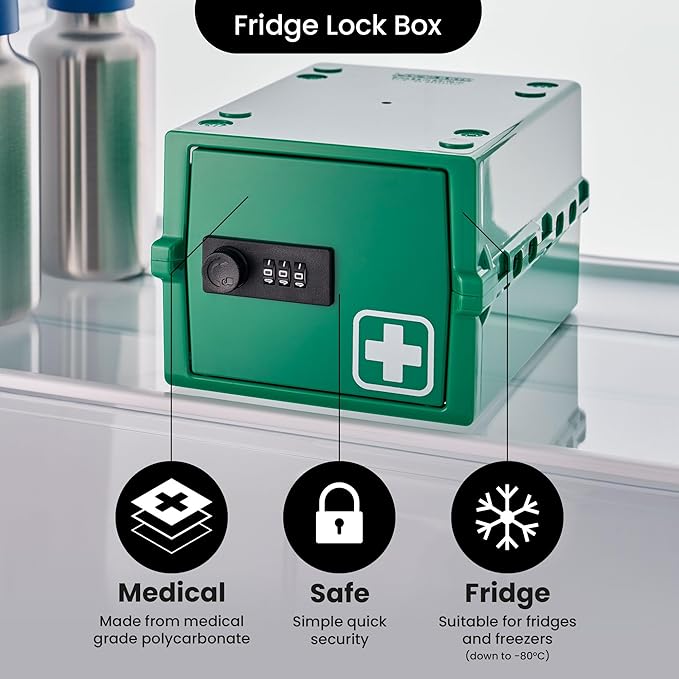 • Small Lock Box For Medication - Securely store small medical items with our compact, impact and shatter resistant Lockabox Mini. Perfect for a handful of tablets, medical pens, small creams and lotions. This premium small medicine lock box features a combination lock for enhanced security, making it a reliable deterrent. Made from durable BPA-safe polycarbonate, it's robust enough for daily medical use and it’s sage for use in the refrigerators and freezers down to -80°C. The Lockabox Mini arrives fully assembled for immediate use in any healthcare setting, offering a small lockable storage box solution that is both practical and efficient. Please check the measurements before purchasing!