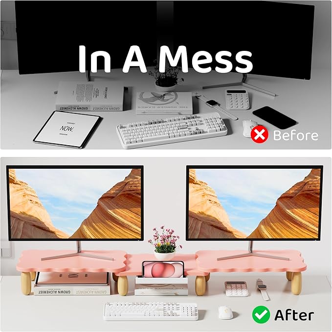 Dual Monitor Riser, Cookie-Shaped Adjustable Length & Swivel Angle, Wooden Desktop Organizer for 2 Monitors,Monitor Stand with Drawer for Laptop, PC, Computer, Printer,Pink