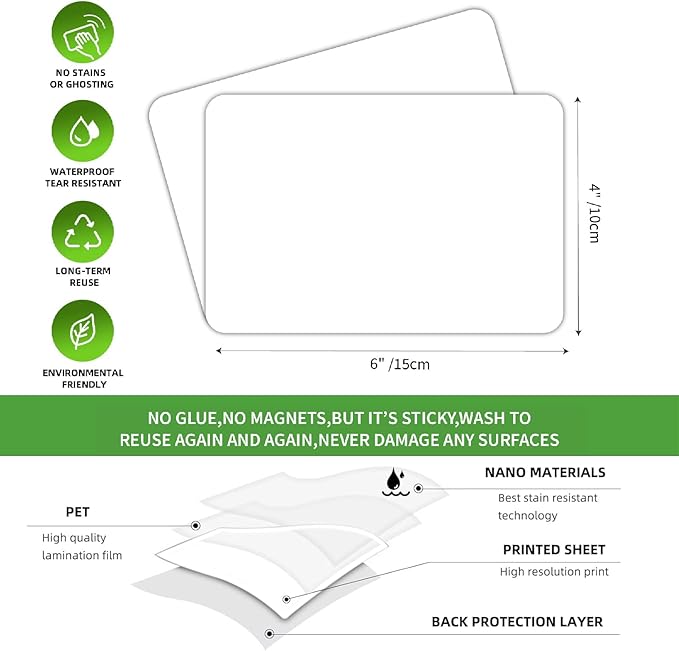 • The Reusable small Dry Erase board hold strong with removable adhesive designed to stick firmly, but will peel away cleanly and easily when needed, each label can be use up 10,000 times, just wash to renew if get dirty or stickless