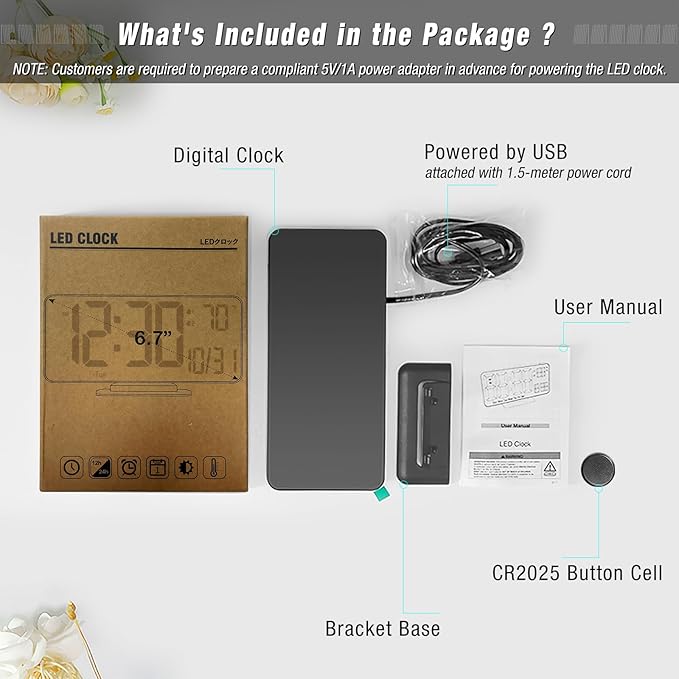 • [Plug-in USB-A Power Supply] The digital clock requires a 5V/1A AC adapter (not included) to operate. It also comes with a button battery, which is only used to preserve the time during power outages.