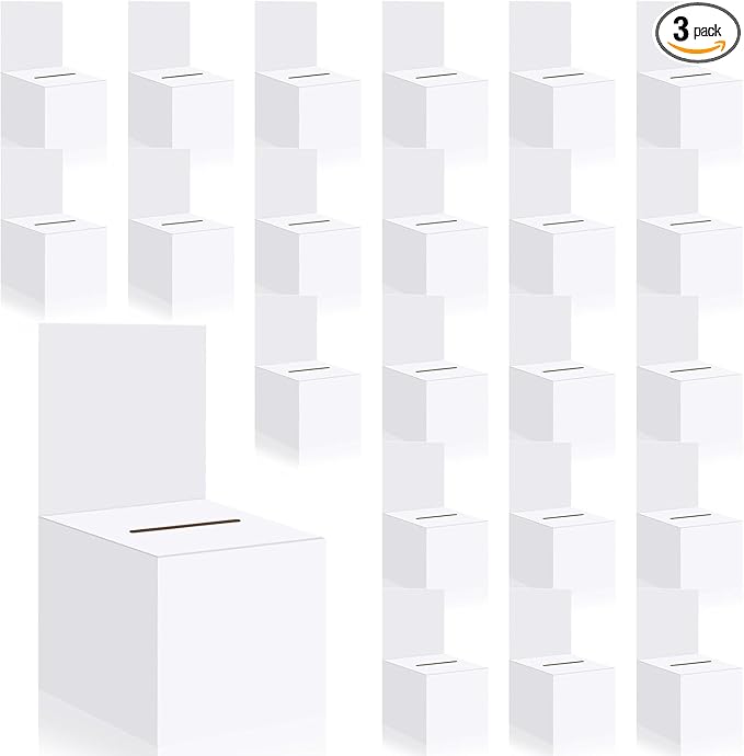 • Widely Used:These raffle boxes can be used in a variety of scenarios, voting, raffle, fundraising raffle box, cardboard suggestion box, contest entry box, wedding reception hint box card box, comment box, charity box, giving box, money collection box, money box, cash box with slot, collecting business cards from the counter or table, etc., money restaurant tip jar, Great for community events, church events, fundraisers, voting places, classrooms