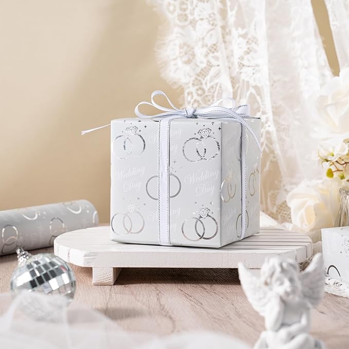 WRAPAHOLIC Wedding Wrapping Paper Roll - Mini Roll - 17 Inch x 33 Feet - Silver Foil Diamond Ring and Wedding Day Lettering Design Perfect for Wedding, Celebration, Party