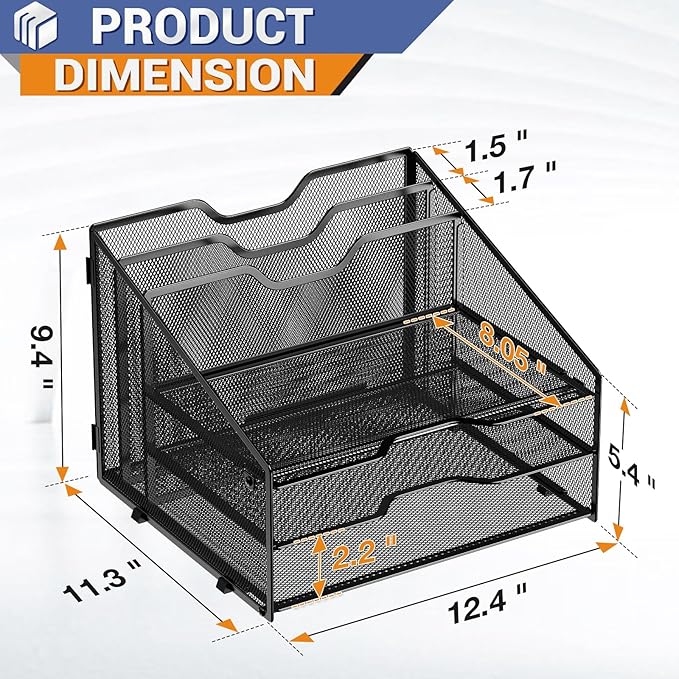 • Dimensions: 12.4"L x 11.3"W x 9.4"H, each horizontal tray :12.4" x 8.05" x 2.2" inch(L x W x H); 2 file holder: 12.4" x 9.4" x 1.5" inch(L x H x W)