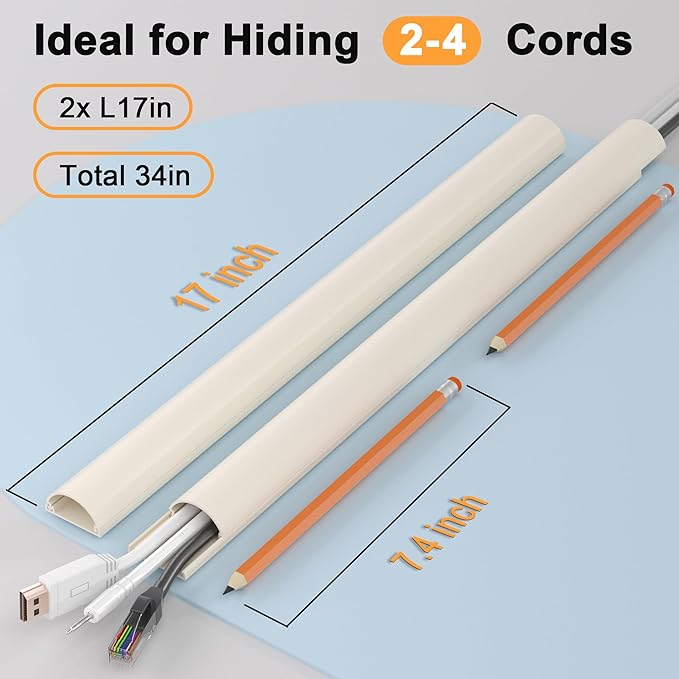• Large Size for 2-4 Cables: Can easily conceal 2 thick extension cords and also comfortably accommodate 4 standard cables, such as a combination of 1 power cord + 1 speaker wire + 1 HDMI cable + 1 Cat6 Ethernet cable. This TV Cord Hider Dimensions: 1.38in (Width) x 0.71in (Height), 2 x 17in Length, 34in Total