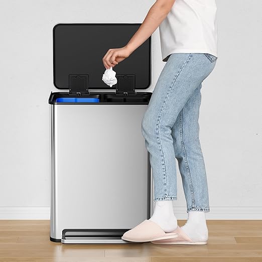 • [Dual Compartments Bin] The 2-compartment trash can simplifies waste sorting, making it easy to separate recyclables from general waste, which promotes eco-friendly practices and encourages responsible disposal.
