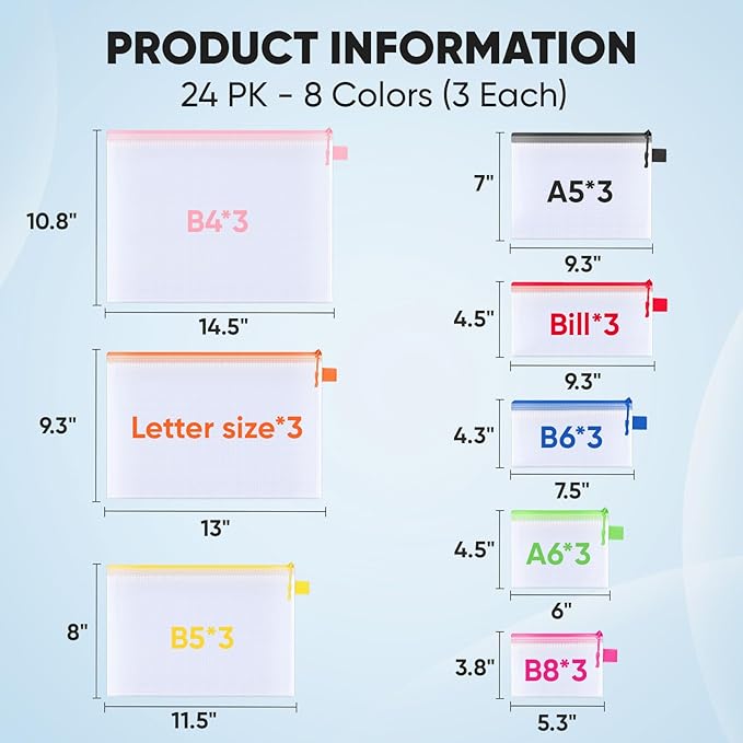 • Pack Options: The mesh zipper pouch bags are available in packs of 10, 20, or 24; The 10- and 20-pack sets are letter-sized, while the 24-pack includes 8 assorted sizes; Each pack comes in multiple colors, making them ideal for organizing and storing items