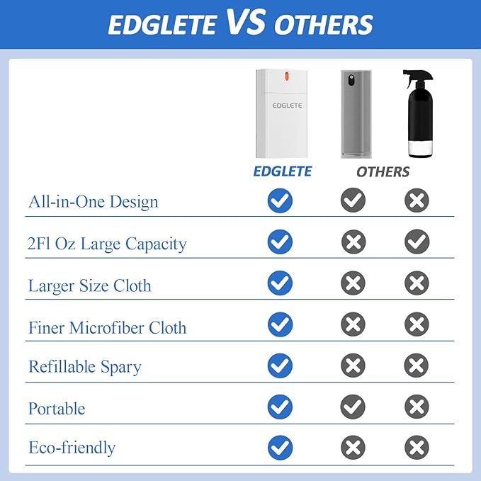 • SAFE FOR SCREENS - Edglete computer screen cleaner is crafted with a safe, gentle, and effective formula, ensuring it is colorless and odorless. This camera lens cleaner's quick-drying screen cleaning spray works seamlessly with the premium microfiber cleaning cloth, which is engineered to protect delicate touch screen coatings, preventing damage and scratches to anti-glare, anti-fingerprint, or oleophobic layers