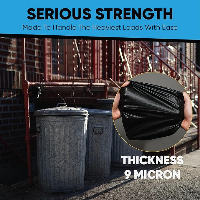 • TEAR-RESISTANT STRENGTH – Made for standard use, these 9 micron black trashbags hold up to everyday garbage and recycling without tearing.