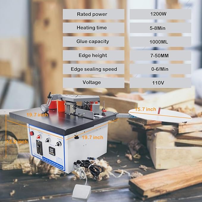 • PRODUCT PARAMETERS:Rated power:1200W,Heating time:5-8Min,Glue capacity:1000ML,Edge height:7-50MM,Edge sealing speed:0-6/Min,Speed control type:electronic speed control,Voltage:110V,Edge shape:straight line/curve,Gluing method:double-sided gluing,Broken tape type:self-feed broken tape,Continuous working time:<12H.