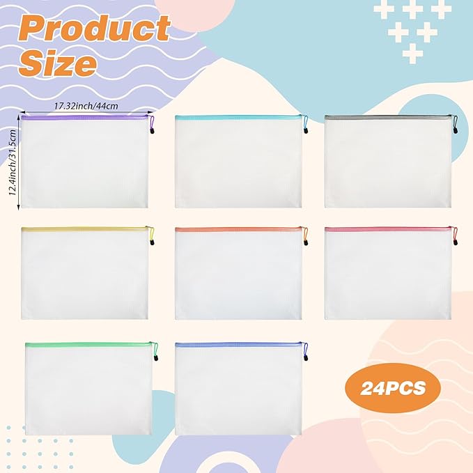 24PCS Mesh Zipper Pouch Bags, A3 17x12 Inches Waterproof Plastic File Puzzle Storage Bags 8 Colors Large Reusable Clear Travel Pouches for Organizing Board Game Office Home School Supplies