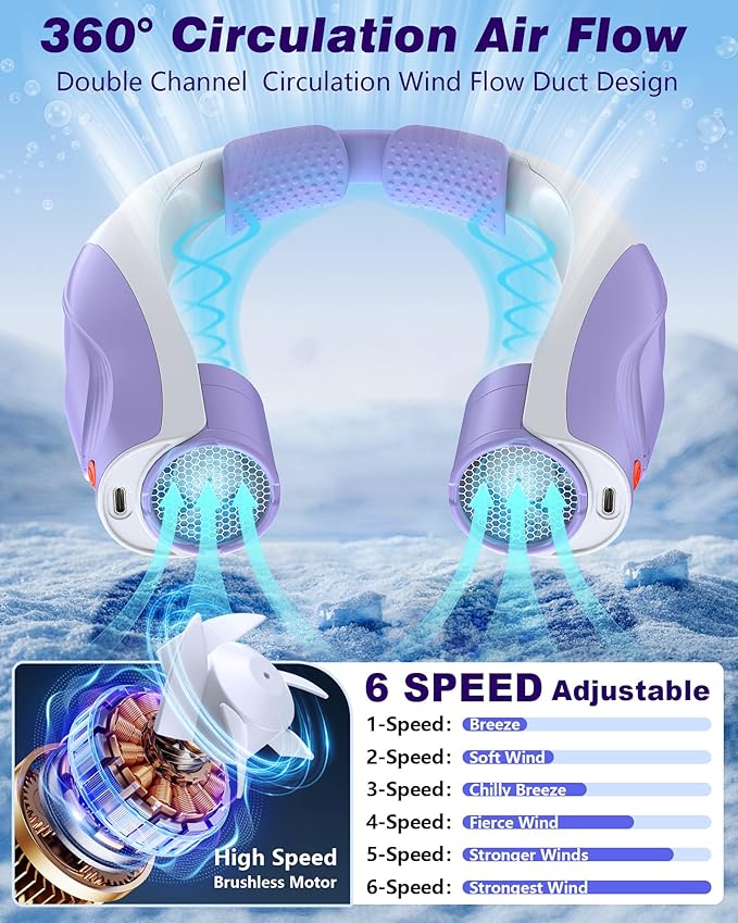 • 6000mAh Long-Lasting Battery: Say goodbye to battery anxiety—this hands-free neck fan is equipped with a robust 6000mAh battery that delivers up to 20 hours of continuous cooling on a single charge. With a fast dual USB-C charging system, it fully recharges in just 5 hours. Ideal for travel, long workdays, summer festivals, or workouts—stay cool wherever you are.