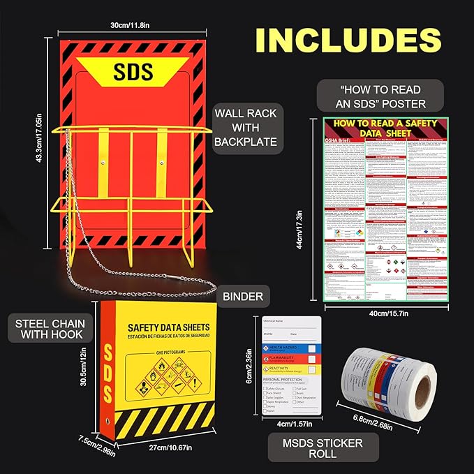 • Workplace Safety Kit:Prioritize workplace safety by maintaining organized and easily identifiable SDS sheets with the SDS Rack and Binder. Mitigate hazards and prevent accidents by ensuring crucial information about hazardous chemicals and materials is readily available.