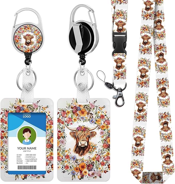 Vintage Highland Cow Lanyards for ID Badge Holder for Women, Cute Florals Teacher Lanyard with ID Holder Clip, Retractable Keychain Badge Reel, Teacher Student Nurse Work Office